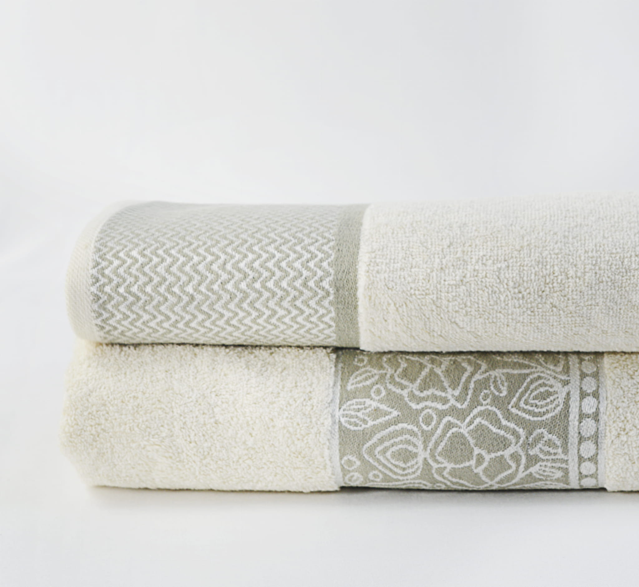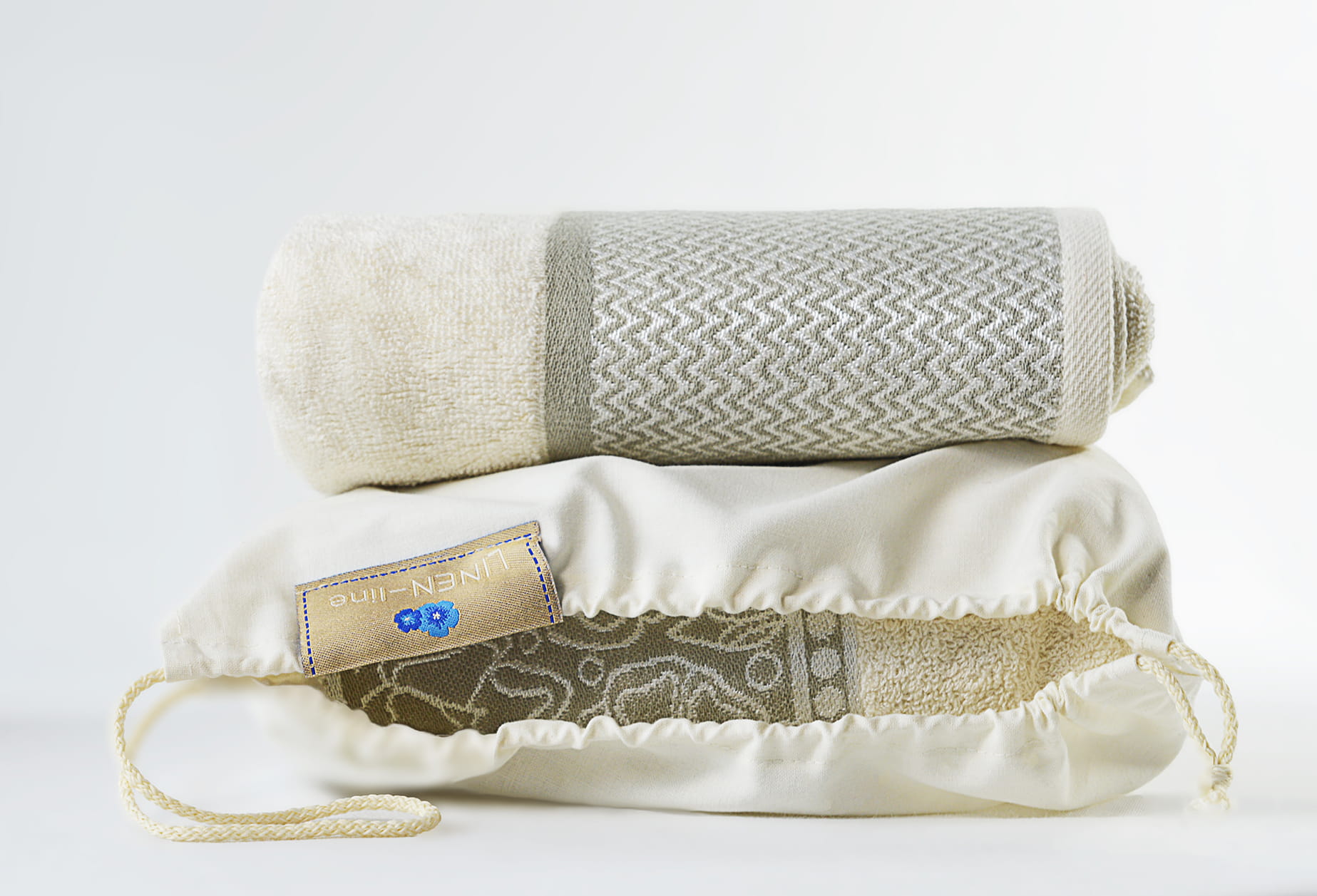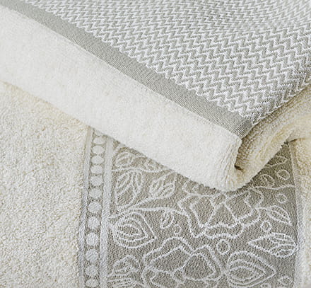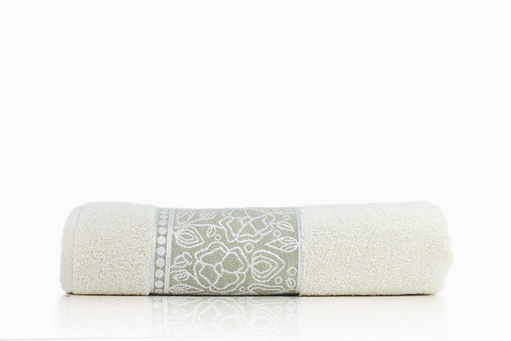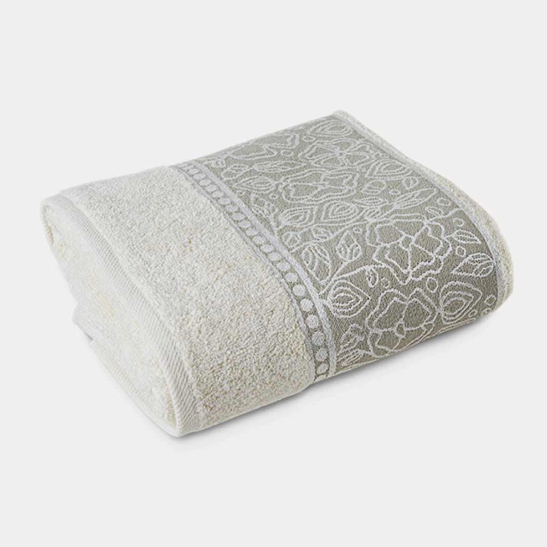 Zdobi go elegancka bordiura z kwiatowym motywem utrzymana w stonowanej kolorystyce. Każdy ręcznik pakowany jest w tkaninowy woreczek.