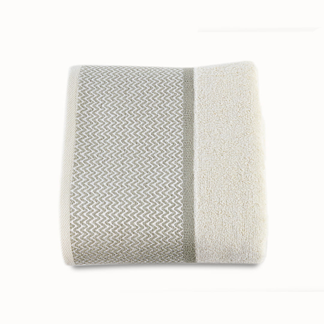 Zdobi go elegancka bordiura z minimalistycznym motywem utrzymana w stonowanej kolorystyce. Każdy ręcznik pakowany jest w tkaninowy woreczek.